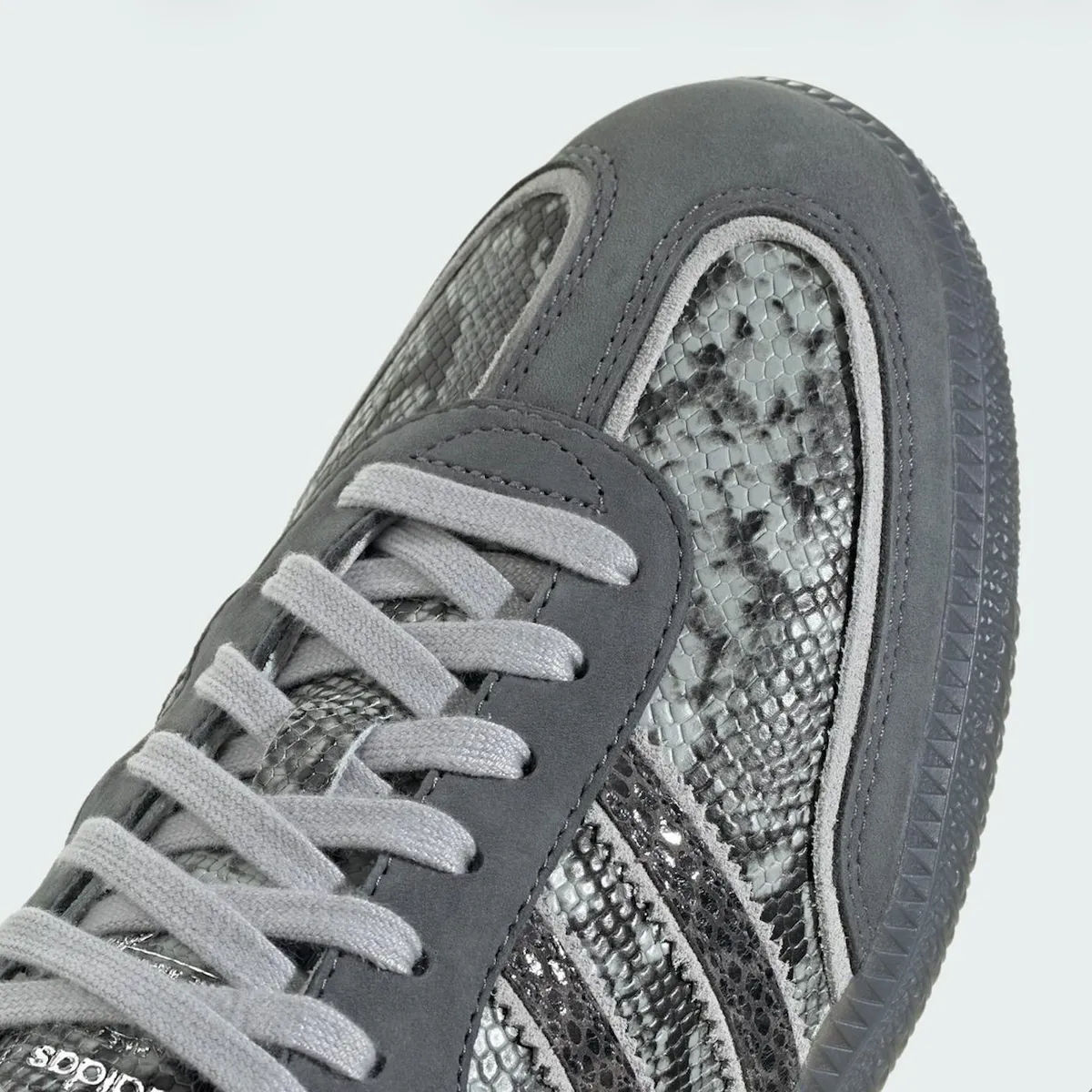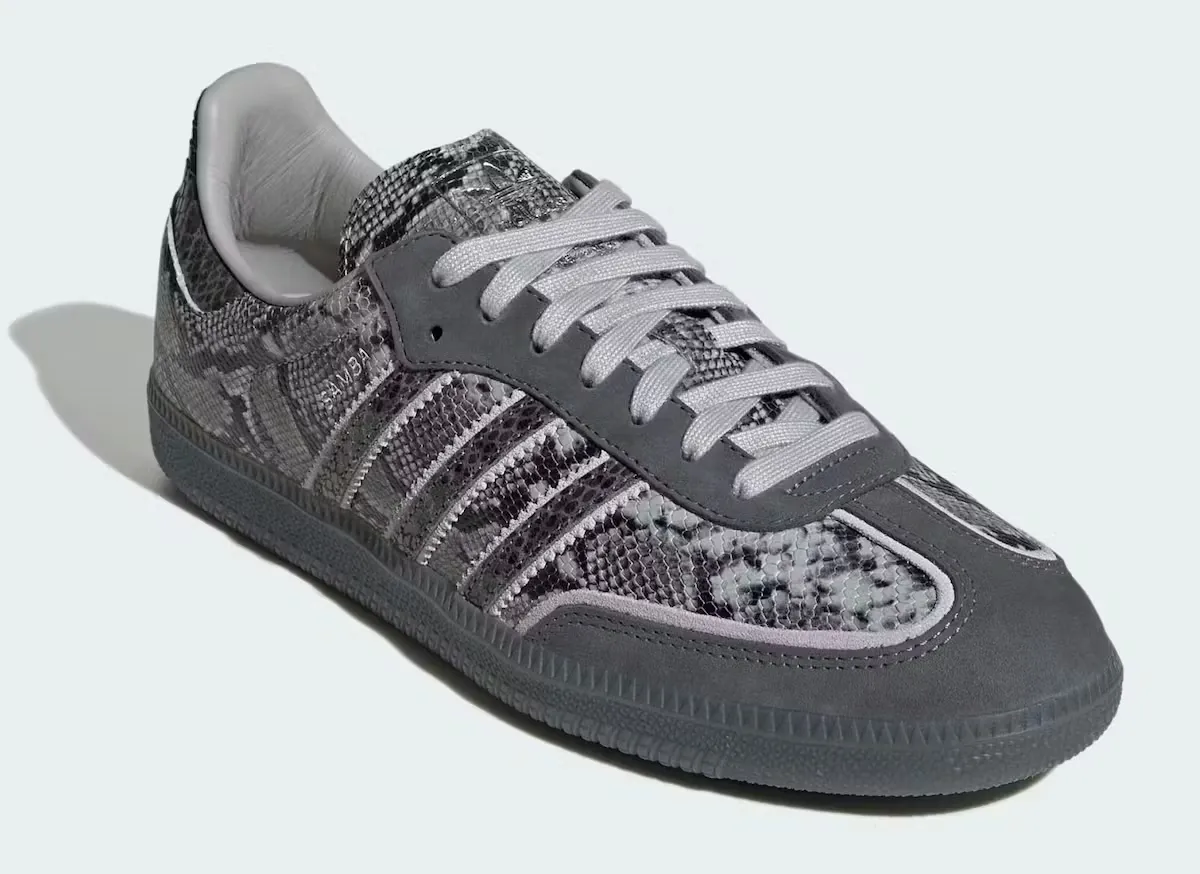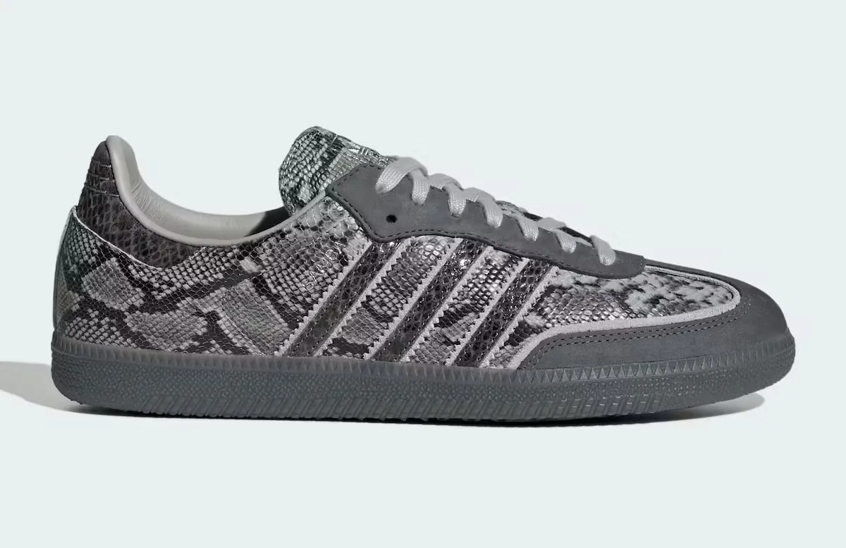 As spotted by Highsnobiety, adidas has given the iconic Samba a head-to-toe snakeskin makeover - but here's the twist that makes it genuinely interesting: the whole thing is done in grayscale. No pop of color, no contrast detail, no loud accents. Just a moody, textured snake print applied across the entire silhouette in shades of grey.